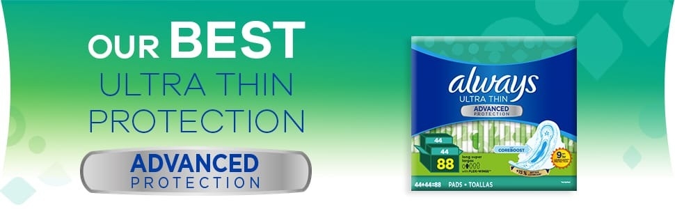 Always Ultra Thin Advanced Long Pads với công nghệ CoreBoost thấm hút thêm 15% chất lỏng và giúp lớp trên cùng luôn khô ráo. Những loại băng vệ sinh tuyệt vời này mang lại cho bạn cảm giác khô ráo và sạch sẽ lâu dài suốt cả ngày.