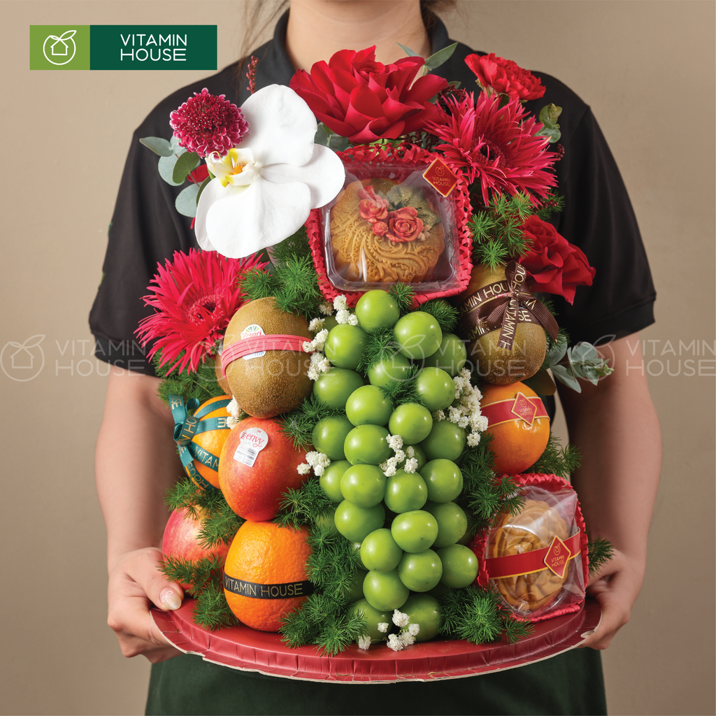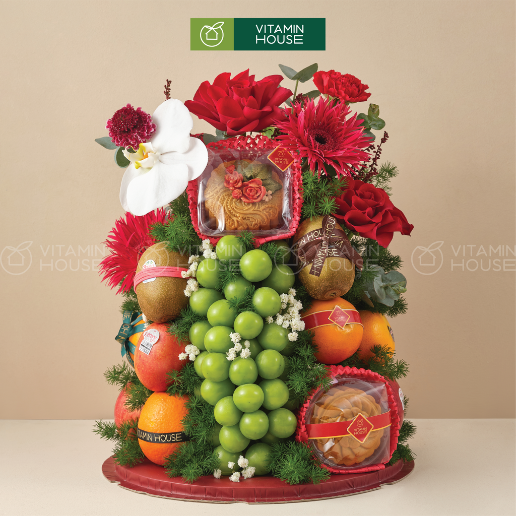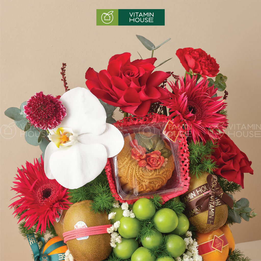 Hộp quà là sự hòa quyện tinh tế giữa trái cây tươi nhập khẩu chất lượng và bánh trung thu thượng hạng. Trang trí cùng hoa tươi tone đỏ nổi bật, sản phẩm là lựa chọn tuyệt vời để biếu tặng đối tác, gia đình, bạn bè dịp Trung Thu – Tết cổ truyền hoặc các dịp đặc biệt khác.