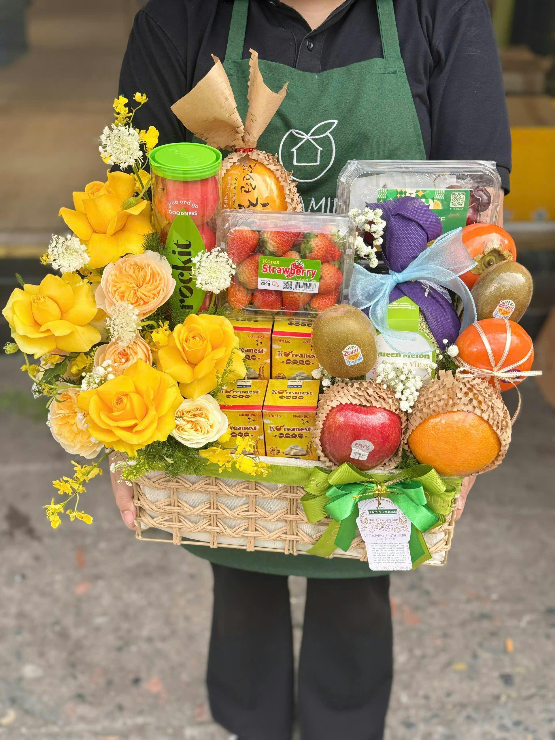 Giỏ quà trái cây là sự kết hợp hoàn hảo giữa trái cây tươi nhập khẩu và yến chưng nhân sâm bổ dưỡng – mang ý nghĩa vừa thẩm mỹ, vừa thiết thực.