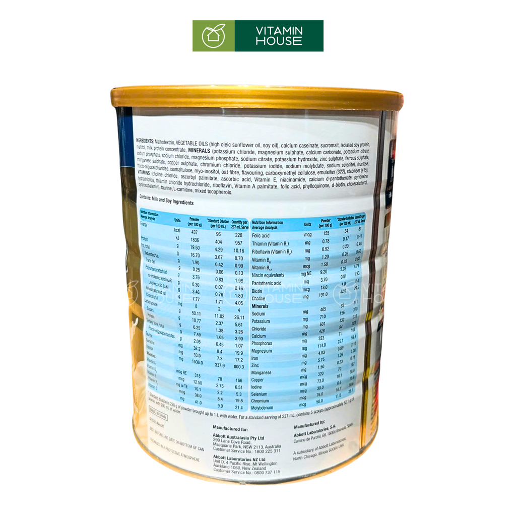 Thành phần Hệ bột đường tiên tiến (Fibersol), hỗn hợp chất béo đặc chế giàu acid béo không no (MUFA & PUFA), Vitamin (A, C, D, E, nhóm B...), khoáng chất (Canxi, Sắt, Kẽm, Magiê...), chất xơ hòa tan, đạm chất lượng cao...