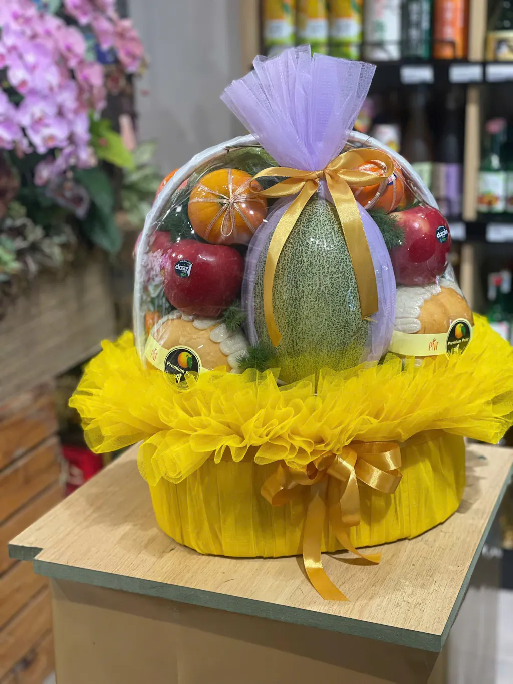 Giỏ trái cây siêu xinh! Mình thích tông màu vàng này nên có nhờ shop chỉnh lại phần lưới, kết quả nhận về ưng ý lắm, nhìn giỏ quà sáng và sang hẳn.